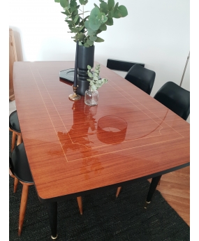 Table de salle à manger vintage, en bois d'acajou vernis.